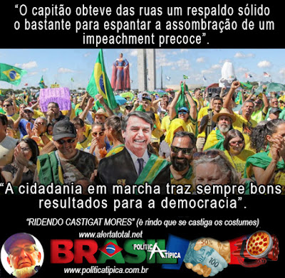 Pudemos ver o apoio à pauta do Presidente da República, com as reivindicações de uma nova previdência, do pacote de medidas anticrime do Ministro da Justiça e de algumas reformas na Educação. Este apoio se fez necessário face o Poder Legislativo, assim como o Poder Judiciário, estarem colocando obstáculos nítidos a essas implementações, que vêm, em verdade, ao encontro do que o Povo deseja.